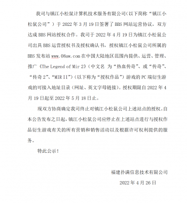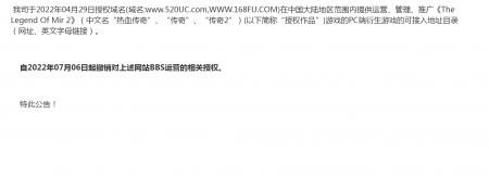 202204-26YY易游m6米乐信息技术有限公司(以下简称“我司”)自2021年获得《热血传奇》原始著作权人独占性授权,一直...